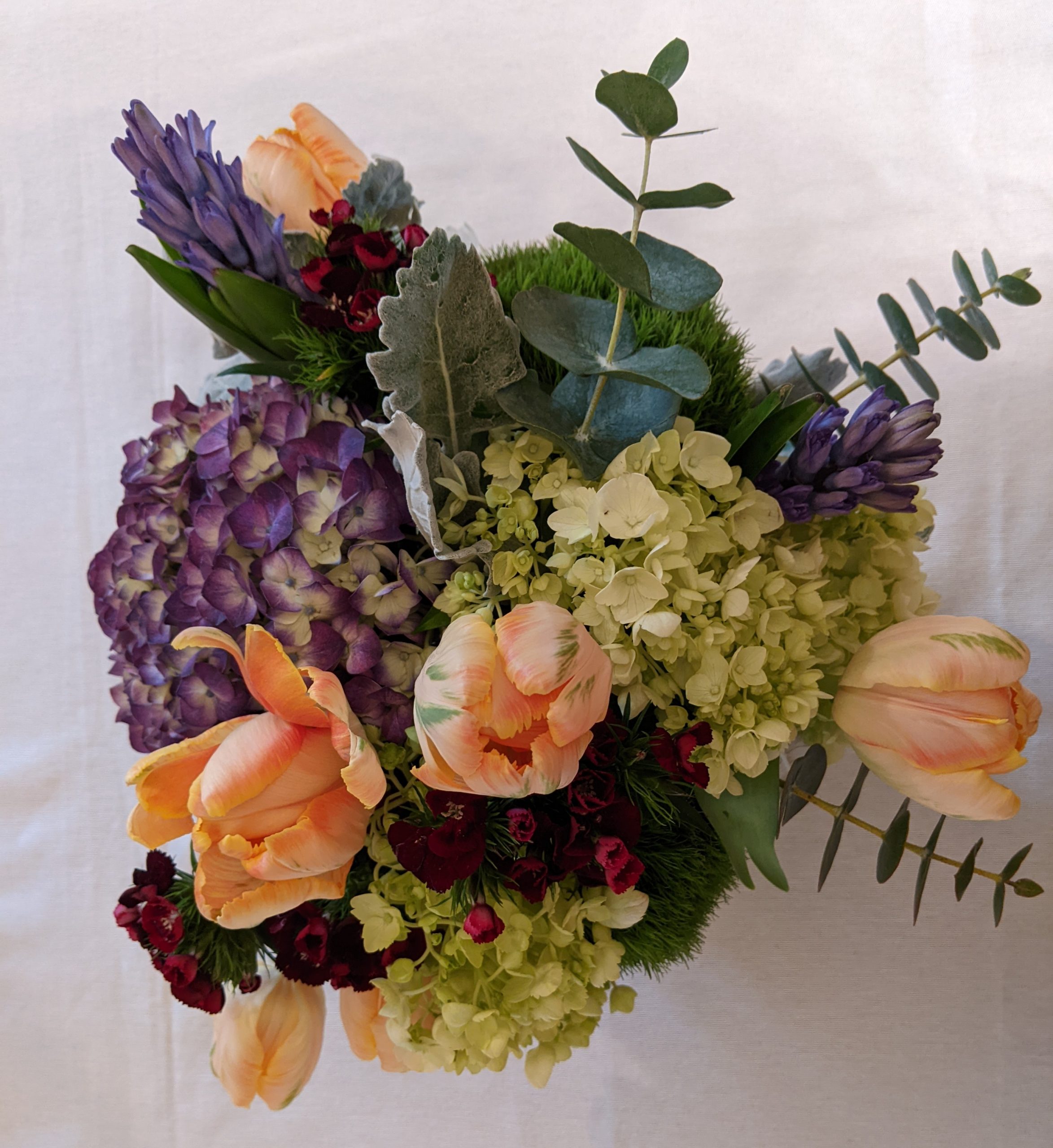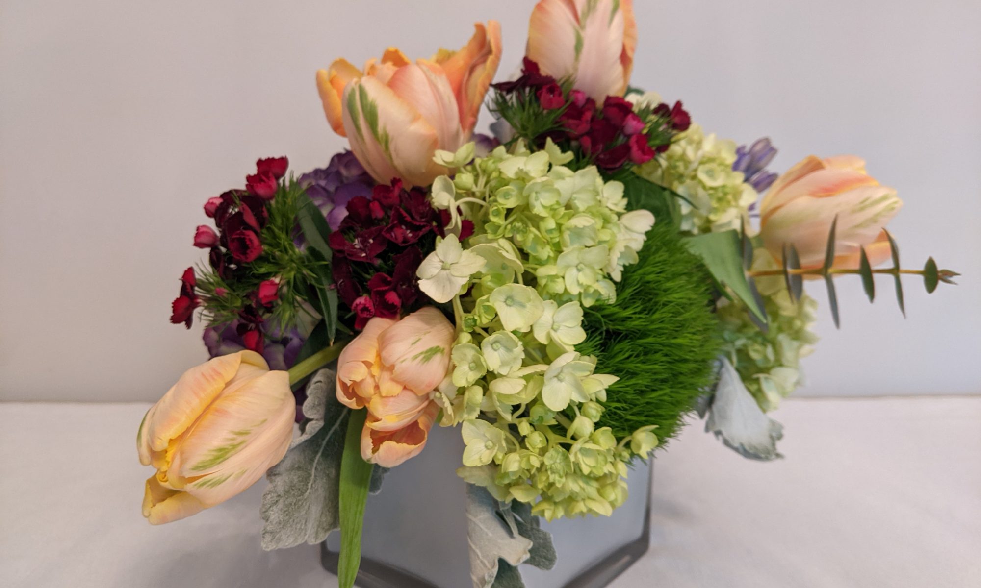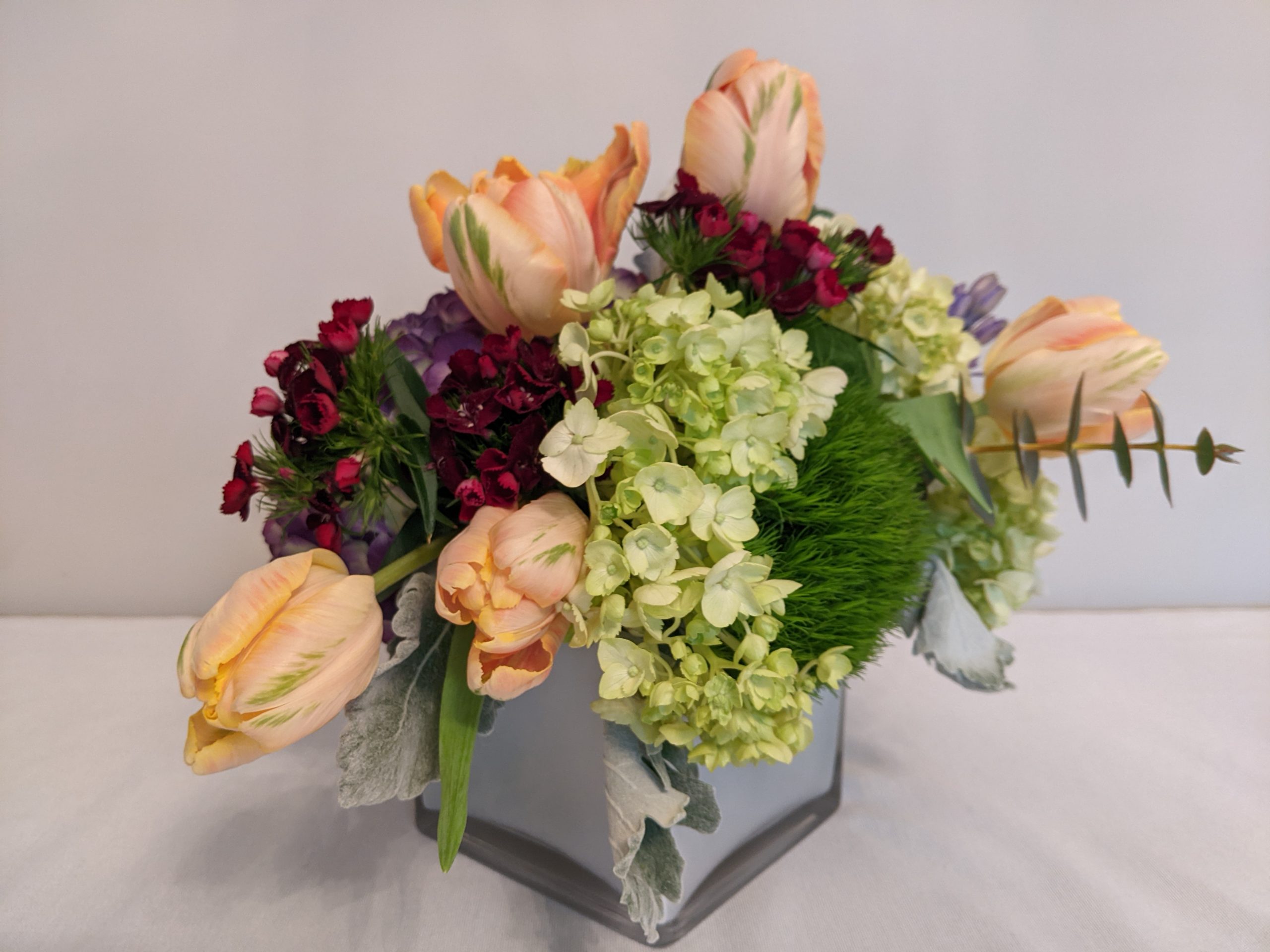 A burst of glamorous color filled with hydrangea’s, green snowball, dianthus, hyacinth, tulip, dusty miller & spiral eucalyptus set in a square frosted glass vase.
